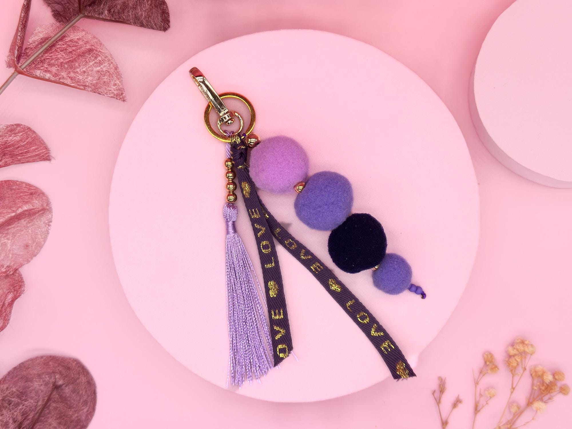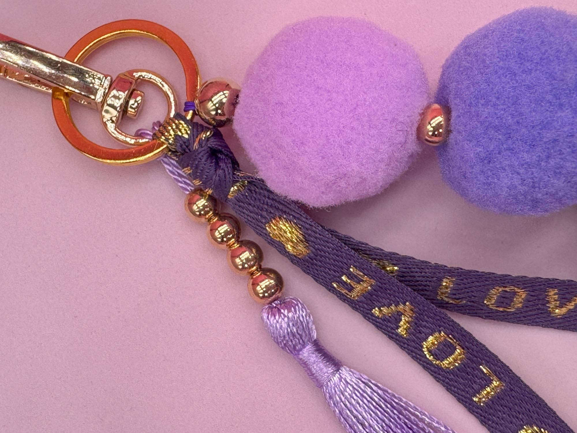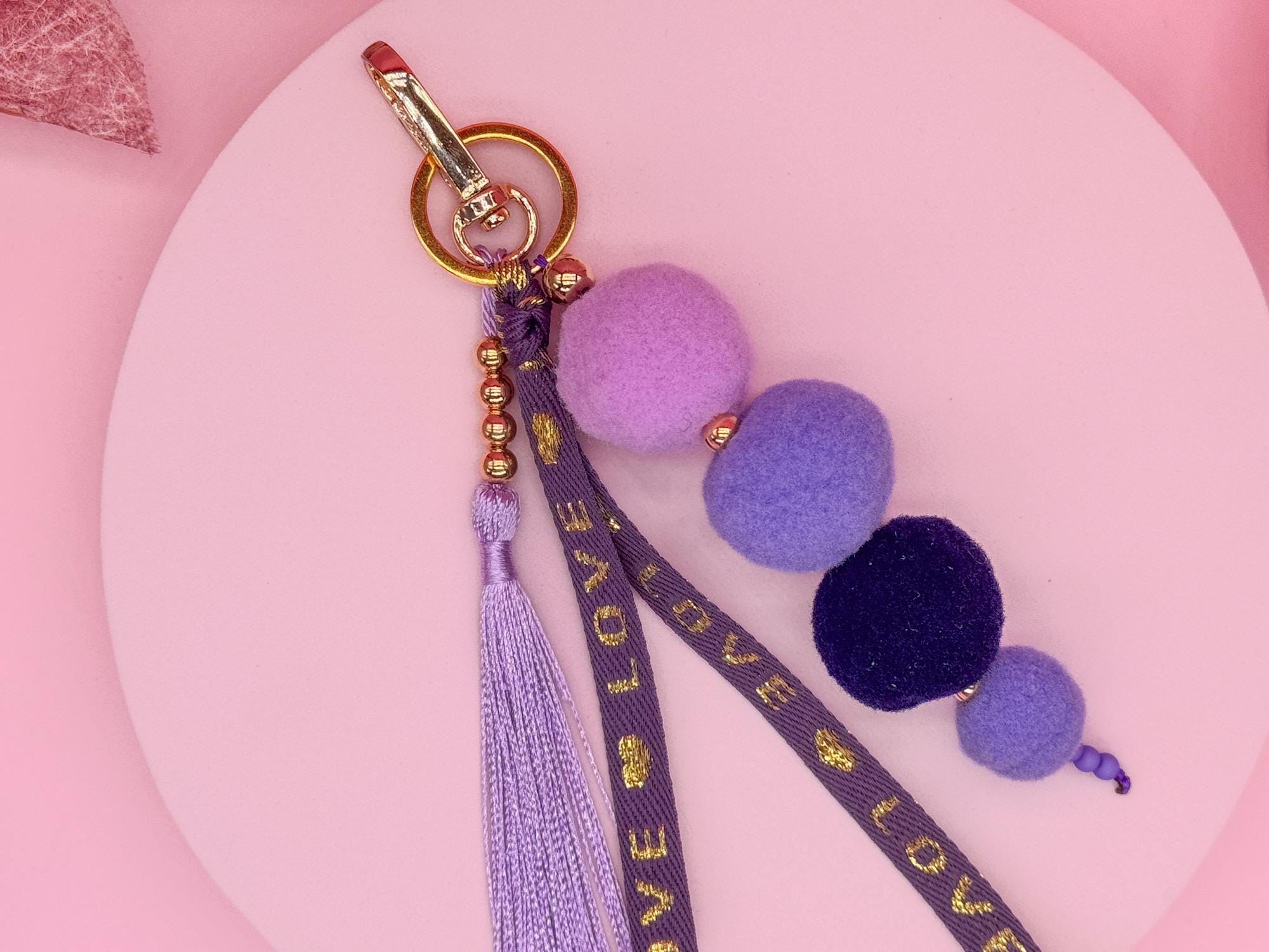 This lovingly handcrafted pom-pom keychain combines soft shades of lilac, lavender, and violet with elegant gold accents. The soft pom-poms provide a unique tactile experience, while the "LOVE" key strap and delicate tassel give the keychain a modern boho look.